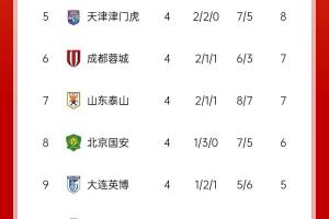 其他比赛天津津门虎2-2北京国安、山东泰山0-3成都蓉城、青岛海牛1-1大连英博、上海申花3-1云南玉昆、长春亚泰1-1武汉三镇。最新积分榜如图。