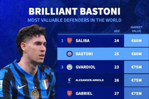 乐鱼在线开户平台-德转最新后卫身价top10:巴斯托尼8000万欧,与萨利巴并列第1