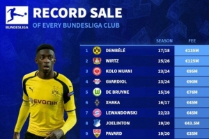 1、多特:登贝莱,1.35亿欧,17-18赛季